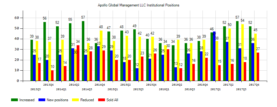 Investors sentiment increased to 0.91 in 2019 Q1. Its up 0.11, from 0.8 in 2018Q4. It improved, as 21 investors sold APO shares while 43 reduced holdings. 25 funds opened positions while 33 raised stakes. 139.89 million shares or 0.33% more from 139.43 million shares in 2018Q4 were reported. Moreover, Usca Ria Ltd Liability has 0.24% invested in Apollo Global Management, LLC (NYSE:APO). Raymond James invested in 64,483 shares. Select Equity Grp Ltd Partnership has 0% invested in Apollo Global Management, LLC (NYSE:APO). 1832 Asset Management LP owns 1.55M shares. The Texas-based Segment Wealth Management Limited Liability Corp has invested 0.25% in Apollo Global Management, LLC (NYSE:APO). Hightower Limited Liability Corporation has invested 0% of its portfolio in Apollo Global Management, LLC (NYSE:APO). Bnp Paribas Arbitrage Sa has invested 0% of its portfolio in Apollo Global Management, LLC (NYSE:APO). Deutsche Savings Bank Ag has invested 0.05% in Apollo Global Management, LLC (NYSE:APO). Moors And Cabot, a Massachusetts-based fund reported 10,000 shares. Advisory Serv Ntwk Ltd Limited Liability Company accumulated 8,128 shares. 559,196 are held by Alkeon Capital Management Lc. Stephens Inc Ar reported 0.01% stake. Karpas Strategies Limited Liability Company holds 0.3% in Apollo Global Management, LLC (NYSE:APO) or 25,000 shares. New Mountain Vantage Advisers Limited Liability accumulated 430,796 shares. Cap Investors owns 10.66M shares or 0.07% of their US portfolio.